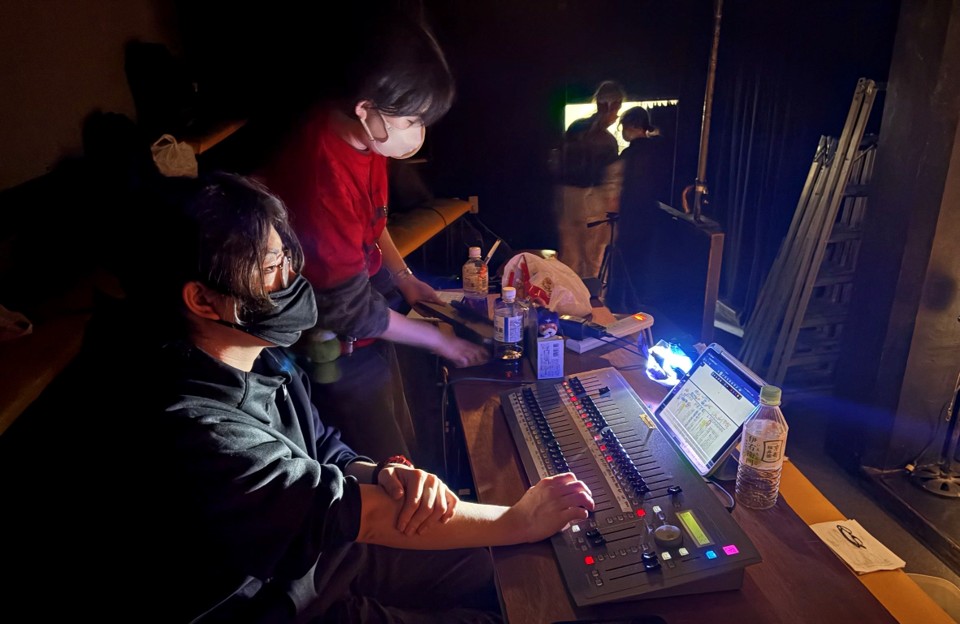 役者演出にとっては劇場で照明を見れるのはこの場当たりが最初なので、慎重に、時間をかけて音照のきっかけを擦り合わせていきます。